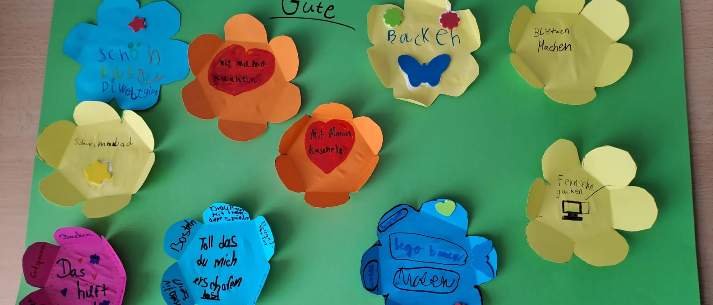 Im März widmeten wir uns der Jahreslosung 2025: „Prüft alles und behaltet das Gute." Die Kinder setzten sich kreativ mit den Fragen auseinander: Was soll ich prüfen? Und was soll ich behalten? Auf bunte Blumen schrieben oder malten sie ihre Vorstellungen.