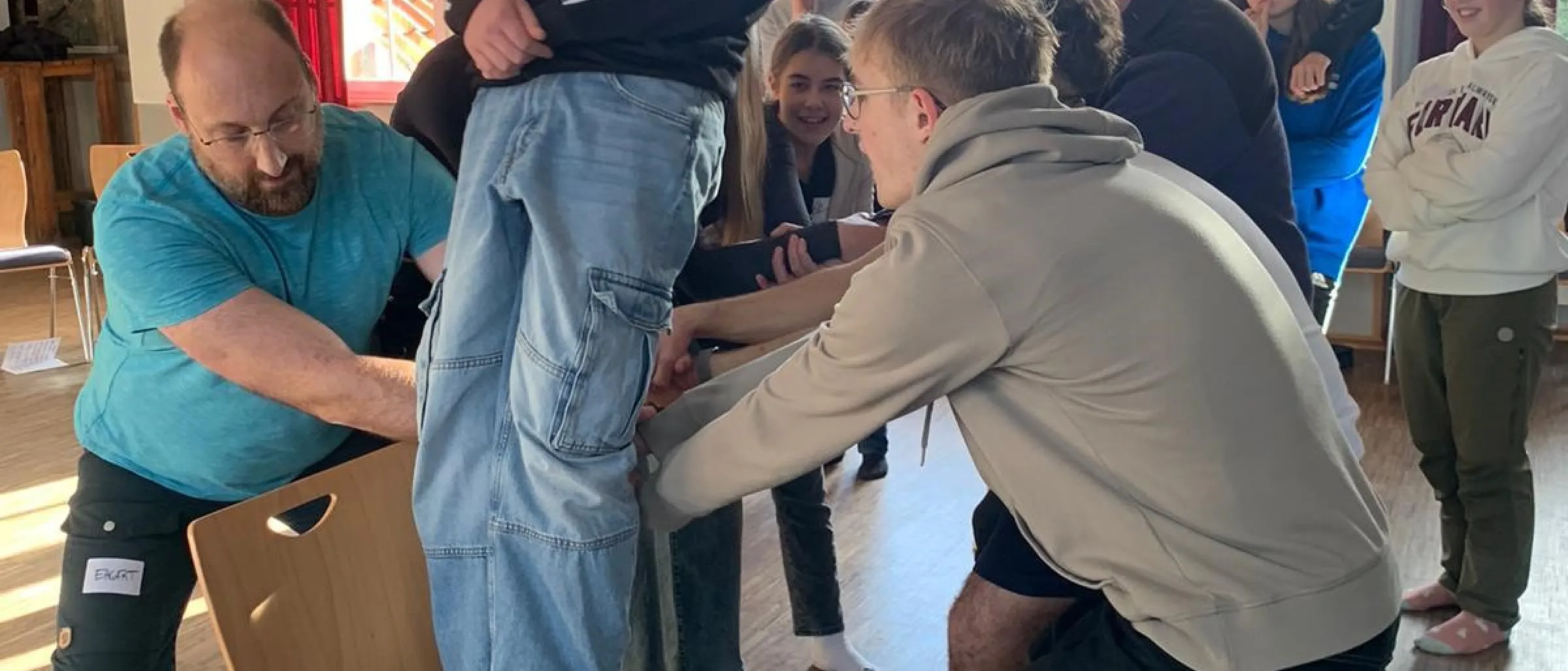 Oft gelingt auf solchen Freizeiten, was im normalen Unterricht meist schwer ist: ein Zusammenwachsen der Gruppe, ein Erleben von Glauben und Gemeischaft und ein Raum, der so geschützt und von Vertrauen geprägt ist, dass man sich als junger Mensch allein und in der Gruppe auspropbieren kann. Wenn das gelingt, ist es ein Geschenk und macht, wie man auf dem Foto sehen kann, großen Spaß!